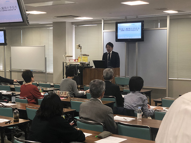 | 開催レポート | 外国人雇用支援センターは、2019年11月7日、「外国人雇用の手引き~募集から採用後の諸手続きまで~」をテーマにしたセミナーを開催しました。 登壇者は、社会保険労務士法人・行政書士法人イイズカ事務所代表の飯塚匡春様(社会保険労務士・行政書士)、行政書士法人GOALの中楯友樹様(行政書士)でした。 外国人雇用に関する最新情報のおさらいをはじめ、在留資格の基礎知識等の外国人雇用を行うにあたり、事前に知っておくべき知識や、外国人雇用への補助金・助成金、労務管理の注意点といった、採用後ポイントまで今すぐ役立つ情報盛り沢山の内容となりました。 また、企業が外国人雇用を推進することのメリットや重要性について、実例を交えながら紹介し、具体的な雇用推進に向けたノウハウも紹介しました。 |
